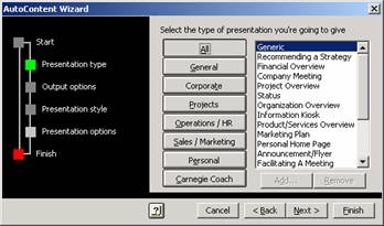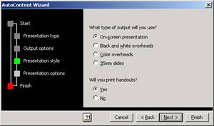 Utilitarul AutoContent Wizard ofera o gama variata de modele de prezentari. In modelul ales, se poate inlocui textul oferit cu cel dorit de utilizator. Daca a fost inchisa caseta de dialog PowerPoint, utilitarul AutoContent Wizard poate fi deschis din meniul principal.