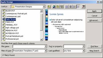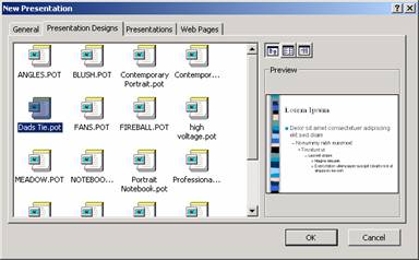 Daca esantioanele predefinite in AutoContent Wizard nu sunt satisfacatoare, se poate alege o prezentare din lista sabloanelor (Template). Daca a fost inchisa caseta de dialog PowerPoint, lista poate fi deschisa din meniul principal.