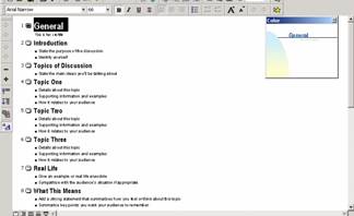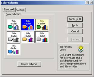 O schema de culori consta din 8 culori, cate una pentru fiecare tip fundamental de element al unei prezentari. Culorile sunt astfel alese incat sa se completeze una pe alta, textul sa se poata citi, corespunzator cu modul de folosite (proiectie sau listare).