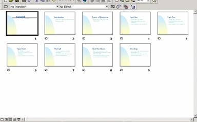 Vederea Slide Sorter afiseaza imagini miniaturale ale diapozitivelor. Acestea pot fi reorganizate sau se poate modifica aspectul general al prezentarii. In aceasta vedere se pot adauga sau edita efecte de tranzitie pentru prezentarea diapozitivelor.