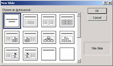 Se creeaza o noua prezentare si se afiseaza caseta de dialog New Slide unde se specifica cu ce fel de diapozitiv se incepe prezentarea si se adauga diapozitivele.