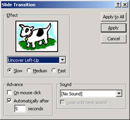 Derularea cursiva a diapozitivelor dintr-o prezentare, mentine treaza atentia. Aplicarea unei tranzitii se face in modul de vizualizare Slide Sorter, din meniul Slide Show, optiune Slide Transition. Apare caseta de dialog cu acelasi nume din care se face alegerea optiunilor. Selectia se poate aplica la diapozitivul curent (butonul Apply) sau la toata prezentarea (Apply to All).