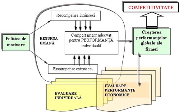Preocuparea pentru performanta si competitivitate a firmelor ce opereaza pe piete puternic concurentiale, a evidentiat faptul ca elementul cheie care determina competitivitatea organizatiilor, cresterea performantelor globale ale acestora este politica de motivare a resursei umane. Astfel, se poate atinge un nivel ridicat al performantei individuale care se reflecta pozitiv asupra performantelor organizatiei, cuantificate prin intermediul indicatorilor economico-financiari. In figura 1 este prezentat modul de interconditionare al acestor procese. Se poate observa ca evaluarea individuala trebuie sa interfere cu evaluarea performantelor economice ale organizatiei, dar acest ultim proces trebuie sa fie aplicat si la nivel individual.