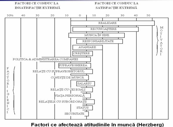 Ø Factorii ce conduc la satisfactie au fost numiti "motivatori", iar cei care conduc la insatisfactie au fost numiti "factori igienici". Motivatorii par a fi strans legati de procesul muncii, in timp ce factorii igienici sunt legati de mediu. Motivatorii par sa fie cei care produc comportamentul adecvat. Factorii igienici pot conduce fie la insatisfactie, fie la lipsa vreunui raspuns