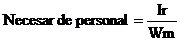 Estimarea numarului de personal pe baza productivitatii muncii - indicatorul productivitatii muncii este considerat fundamental in previzionarea necesarului de personal. Productivitatea muncii este calculata prin raportarea valorii productiei sau a valorii adaugate la numarul de personal. Avind in vedere ca productivitatea muncii se afla in relatie directa cu numarul de personal utilizat, exista conditii pentru a se stabili un raport exact intre cele doua variabile. Atunci cind se doreste indeplinirea unui anumit nivel al productivitatii muncii (Wm) si luind in considerare alte obiective strategice ale organizatiei (sub forma unui indicator de rezultate Ir) se poate stabili necesarul de personal dupa formula: