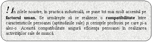 Cerintele industriei impun acordarea unei atentii deosebite factorului uman implicat in procesul de productie in sensul utilizarii sale integrale si la parametrii cei mai inalti. Acest lucru inseamna incadrarea fiecarei persoane corespunzator posibilitatilor sale psihologice, fiziologice si fizice, precum si a pregatirii sale profesionale.