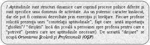 Aptitudinile reprezinta potentialitatile active continute in programul genetic al individului, ele presupun existenta unor structuri functionale dinamice care cuprind procese psihice diferite si care au un caracter specific. Existenta unei aptitudini este conditia efectuarii cu succes a unei activitati; aptitudinile se traduc prin randament sau performanta, indicator al nivelului psihogenetic (grad de dezvoltare) si prin functionalitate. Dar, caracteristica aptitudinilor este si posibilitatea formarii lor prin exercitiu, prin invatare, proces de formare si a deprinderilor (actiuni voluntare automatizate). Totusi, intre aptitudini si deprinderi apar deosebiri sub aspectul complexitatii, raportul fiind invers proportional; sub aspectul continutului - aptitudinile au un caracter polivalent; sub aspectul caracterului formativ - aptitudinile sunt in permanenta dezvoltare, in timp ce deprinderile prezinta o limita superioara a posibilitatilor de dezvoltare. Aptitudinile sunt considerate ca si conditii interne ale formarii deprinderilor (Rosca si Zrg, 1972).