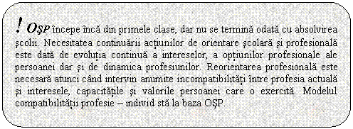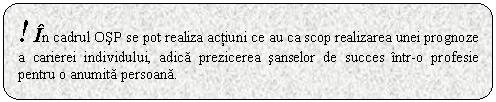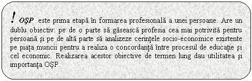 OSP este prima etapa in formarea profesionala a unei persoane. Are un dublu obiectiv: pe de o parte sa gaseasca profesia cea mai potrivita pentru persoana si pe de alta parte sa analizeze cerintele socio-economice existente pe piata muncii pentru a realiza o concordanta intre procesul de educatie si cel economic.