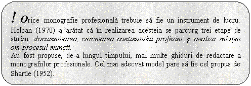 O monografie profesionala trebuie sa fie un instrument de lucru. Pentru aceasta au fost propuse mai multe ghiduri de redactare dintre care cel indicat de Shartle (1952) este mai adecvat actualelor conditii ale muncii industriale. Aceasta contine urmatoarele elemente :
