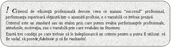 Criteriul de eficienta profesionala descrie ceea ce numim "succesul" profesional, performanta superioara obtinuta intr-o anumita profesie, e o variabila ce trebuie prezisa. Un criteriu bine ales este acela care are o fidelitate crescuta, dispune de o buna validitate si este realizabil.