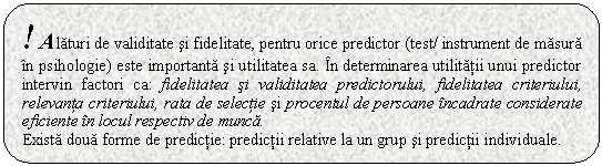 Cel mai utilizat tip de predictori este testul psihologic care ne ajuta sa masuram ceva (un anumit comportament) si pe aceasta baza sa putem face clasificari ale personalului. Utilizarea unui test trebuie sa aiba in vedere erorile ce pot fi facute luand ca adevarate rezultatele obtinute in urma aplicarii sale. Eroarea poate fi semnificativ mai redusa daca folosim un instrument de masura fidel si valid. Alaturi de validitate si fidelitate, pentru orice predictor este importanta si utilitatea sa.