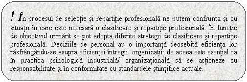 Situatia de selectie tipica presupune alegerea sau nu a unui candidat pentru un anumit loc de munca. In practica vom fi confruntati si cu alte situatii. De pilda, o companie poate scoate la concurs mai multe locuri de munca. In acest caz, este neeconomic sa examineze separat pe fiecare candidat pentru fiecare post de munca in parte. Profitand de avantajul ca la concurs s-au prezentat mai multi candidati, se va incerca sa se faca o repartitie cat mai adecvata la locurile de munca disponibile. In acest caz se administreaza o baterie de teste extinsa, care sa acopere toata gama aptitudinala ceruta de posturile scoase la concurs. Pe baza performantelor la teste, vom putea lua in considerare fiecare candidat in conexiune cu postul sau posturile pentru care este cel mai potrivit. Aceasta este o problema de clasificare. Figura 1.9. ilustreaza o astfel de situatie de clasificare si cateva strategii care se pot adopta.