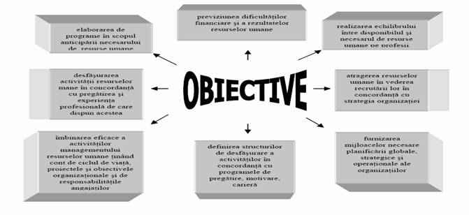 Obiectivele previziunii necesarului de resurse umane elaborarea de programe in scopul anticiparii necesarului de resurse umane previziunea dificultatilor financiare si a rezultatelor resurselor umane realizarea echilibrului intre disponibilul si necesarul de resurse umane pe profesii imbinarea eficace a activitatilor managementului resurselor umane tinand cont de ciclul de viata, proiectele si obiectivele organizationale si de responsabilitatile angajatilor definirea structurilor de desfasurare a activitatilor in concordanta cu programele de pregatire, motivare, cariera furnizarea mijloacelor necesare planificarii globale, strategice si operationale ale organizatiilor atragerea resurselor umane in vederea recrutarii lor in concordanta cu strategia organizatiei desfasurarea activitatii resurselor mane in concordanta cu pregatirea si experienta profesionala de care dispun acestea.