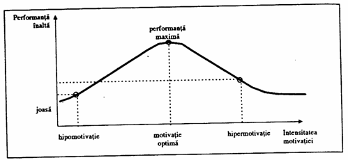 S-a constatat ca pentru sarcinile simple de munca, performantele ridicate se realizeaza pe seama unor motivatii intense, dar in cazul muncilor complexe (cum ar fi muncile intelectuale, mai ales cele de creatie) o motivatie intensa, prin fenomenele emotionale asociate, blocheaza performanta, deci este de preferat o motivatie intensitate moderata. In graficul de mai sus, nu este precizat continutul motivatiei, ea fiind considerata in mod general, constelatia de motive variind la un individ la altul, de la o situatie la alta. Aceeasi performanta poate fi datorata unor motive diferite: A lucreaza foarte bine pentru ca ii place ceea ce face si B lucreaza foarte bine pentru ca are nevoie de bani. Motivele care genereaza aceasta performanta sunt variabile: poate ca lui B nu-i place deloc ceea ce face, dar banii pe care-i castiga in urma muncii sunt importanti. Poate ca pentru A este atat de important ceea ce face incat prefera sa castige mai putin decat si faci ceea ce nu ii place[2].