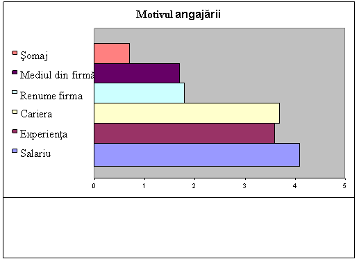 Salariul ca motiv al angajarii apare la toti cei chestionati ca fiind cel putin important. Astfel pentru 40% dintre respondenti este cel mai important motiv, pentru înca 60% dintre acestia este foarte important si important.