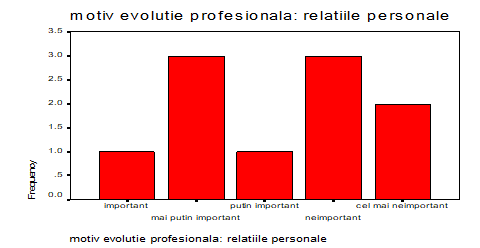 Relatiile personale sunt considerate de 3% dintre respondenti mai putin importante, iar de alti 3% dintre acestia neimportante. Cel mai mic calificativ obtinut a fost de factorul important, cu o frecventa de 1% si de putin important tot cu 1%. Relatiile personale sunt considerate de 2% ca fiind cel mai neimportant motiv al evolutiei profesionale .