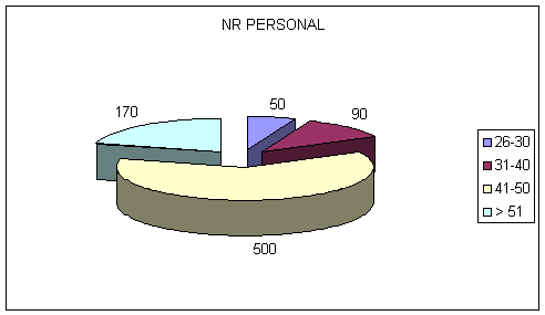 In legatura cu structura dupa studii constatam ca personalul cu studii medii si postliceale este preponderent cu 45,5 %, urmat de personalul cu scoli profesionale cu 33, 33% iar apoi cel cu studii superioare cu 21,11%.