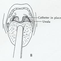 se introduce cateterul cu miscari blande paralel cu palatal osos si perpendicular pe buza superioara