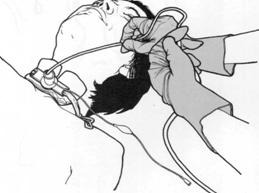 cand bolnavul s-a obisnuit cu masca, se aseaza cureaua de fixare in jurul capului