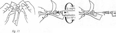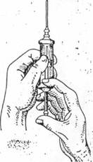 Dupa ce fiola a fost sparta, se introduce acul pana la fundul fiolei sau pana la locul unde ajunge iar in acest caz se apleaca fiola care se tine in mana stanga iar seringa in dreapta. Tractiunea pistonului se face cu degetele 2-3 ale mainii drepte. Cu degetul mare de la mana stanga se face un contrasprijin pe corpul seringii.