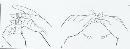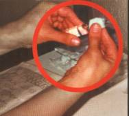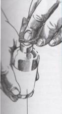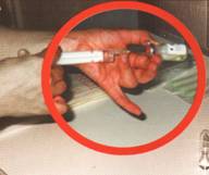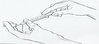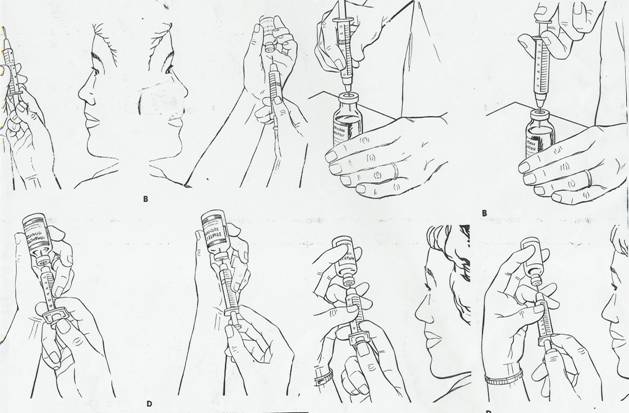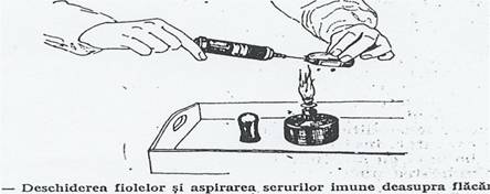 se trece fiola deschisa deasupra flacarii si se tine intre police, index si degetul mijlociu al mainii stangi, cu deschizatura catre seringa care va fi tinuta cu mana dreapta