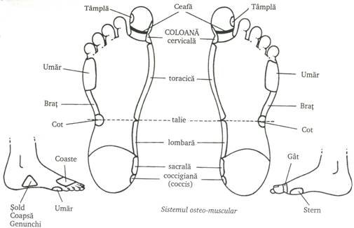 zone reflexe pentru sistem osos (coloana vertebrala, umar, brat, cot, sold) - 3-5 minute fiecare