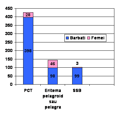 Material. Studiul de fata a urmarit un lot de bolnavi etilici cronici, in numar de 670, cu una sau mai multe din urmatoarele boli dermatologice: porfirie cutanata tardiva (PCT), pelagra (orice forma clinic manifesta), sindrom Bureau-Barriere (SBB).