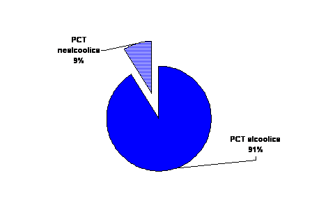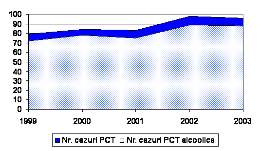 2. Pe un lot de 426 bolnavi etilici cronici cu PCT (90,61% din totalul de orice PCT de orice etiologie - proportia medie pe 5 ani, cu variatii nesemnificative de-a lungul anilor), am gasit ca proportia femeilor este relativ mica (6,57% din bolnavii lotului) si ca ponderea femeilor nu a inregistrat modificari semnificative in timpul celor 5 ani studiati.