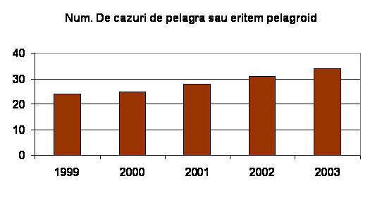 Numarul de bolnavi cu pelagra (forma clinica completa sau incompleta) a crescut de la an la an in perioada 1999-2003, cu ascensiune evidenta in ultimii 2 ani (31 de bolnavi in 2002 si 34 in 2003), in relatie cu cresterea alcoolismului cronic si posibil cu scaderea nivelului de trai (dieta insuficienta cantitativ, calitativ) in anumite paturi sociale dupa 1991.