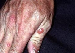 Foto 3: Etilism cronic, Porfirie Cutanata Tardiva: examenul local arata leziuni bulo-erozivo-crustoase si atrofice pe fata dorsala a mainii. |