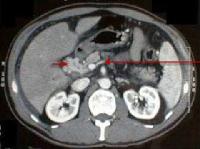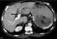 Foto 9: Carcinom hepatocelular grefat pe o ciroya hepatica de etiologie alcoolica, complicat cu tromboza de vena porta (sageata scurta trombul cu o intrerupere brusca a traiectului portei, sageata lunga indica dezvoltarea circulatiei compensatorii). |