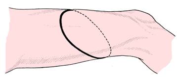 Fig. 7 - Amputatia tenoplastica de coapsa dupa tehnica Callander: linia de incizie