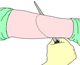 Incizia pielii trebuie sa fie la cel putin 15 cm sub nivelul de sectiune al osului. Incizia are aspect de "bot de rata", lamboul anterior fiind mai lung cu 3-4 cm, iar comisurile sunt plasate pe fetele interna si externa ale coapsei.