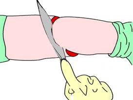 Amputatia prin procedeul lent al lui Huard si Montagne foloseste anestezia locala prin infiltrare plan cu plan si sectiunea straturilor din aproape in aproape; se foloseste rar la ora actuala, pentru cazurile cu risc crescut (Fig. 9).