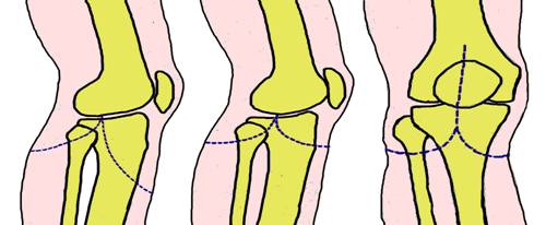 Pe fata externa a genunchiului, rotat intern, se sectioneaza tendonul bicepsului. Pe fata anterioara, se sectioneaza aripioarele rotuliene si ligamentul rotulian la nivelul tuberozitatii anterioare a tibiei.