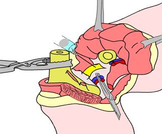 Pensa proximala este indepartata si zona strivita este ligaturata cu un fir resorbabil 0. Se indeparteaza si pensa distala, lasand un segment scurt din nerv, aplatizat, care previne alunecarea ligaturii. I se permite nervului sa se retracte in sus, in stratul muscular si nu se fixeaza la planurile adiacente. Tesuturile musculare restante sunt eliberate de pe suprafata posterioara a femurului (Fig. 6).
