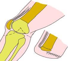 Se controleaza hemostaza si se spala plaga. Tendoanele muschilor ischio-gambieri se sutureaza cu fire resorbabile la tesutul fibros prerotulian si la ligamentul prerotulian (Fig. 8). Se sutureaza pielea.