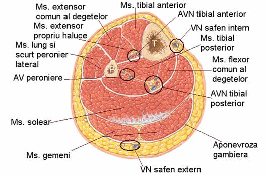 Pe sectiune, gamba este alcatuita din piele, vasele si nervii superficiali, aponevroza si musculatura, scheletul osos.