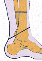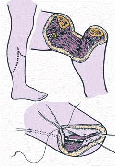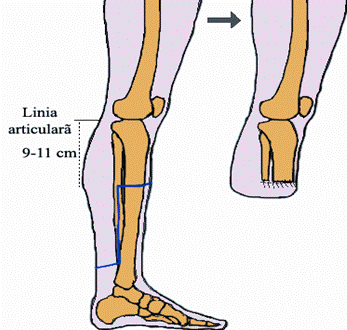 Se sectioneaza tibia in 1/3 inferioara si, putin mai sus, peroneul. Se sutureaza aponevroza, apoi pielea.