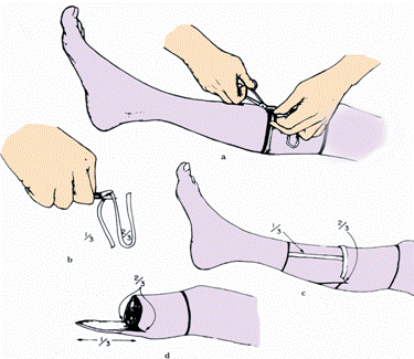 In prealabil, se marcheaza incizia cutanata. Are forma de U larg, cu bratul intern pe fata interna a gambei, la nivelul tibiei, iar bratul extern trece in spatele muschilor peronieri.