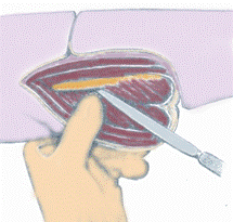 crearea unor lambouri musculo-cutanate lateral si medial, inegale sau egale, prin intermediul unor incizii sagitale;