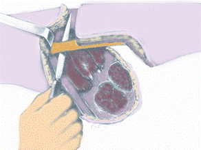 Pentru a permite abordul in loja musculara profunda, se va sectiona aponevroza profunda la nivelul marginii posterioare a tibiei si la nivelul marginii posterioare a peroneului. Cu ajutorul indexului si al policelui stang se prind muschii profunzi, se sectioneaza oblic incepand cu originea tendonului lui Achile retractat (Fig. 6).