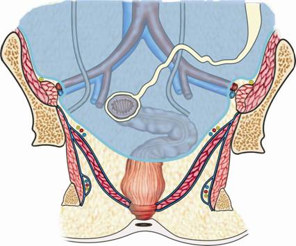 2. Rectul pelvin subperitoneal are raporturi anterior, la barbat, prin fascia lui Denonvilliers, cu prostata, veziculele seminale, portiunea terminala a canalelor deferente si segmentul retrotrigonal al vezicii, iar la femeie cu peretele posterior vaginal. Lateral, se gasesc ureterele si arterele rectale mijlocii, iar posterior tesut celular lax ce permite decolarea rectului.