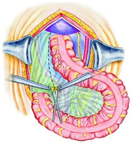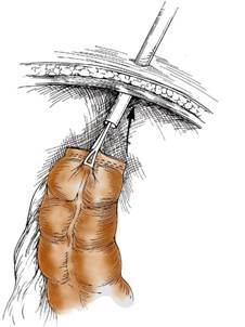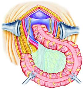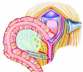 Rectosigmoidul este, astfel, eliberat si se poate trece un fir deasupra leziunii.