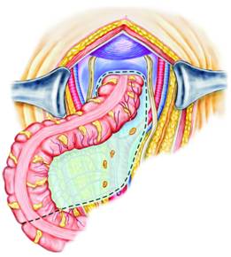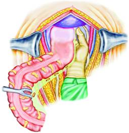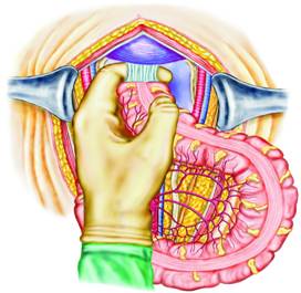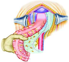 Dupa ce intestinul subtire este introdus intr-un sac de plastic steril sau este fixat in etajul abdominal superior cu un camp mare umed, urmatorul pas este mobilizarea sigmoidului care, in mod obisnuit, este fixat in fosa iliaca stanga. Sigmoidul este inclinat medial, astfel incat se pun in evidenta benzile fibroase care il fixeaza de peritoneul pelvin stang (Fig. 2). Aceste aderente sunt sectionate cu un foarfece curb, apoi sigmoidul este mobilizat usor catre linia mediana.