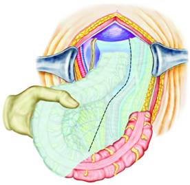 Mobilizarea incepe cu liza aderentelor sigmoidului la peretele lateral. Sigmoidul si colonul stang sunt mobilizate.
