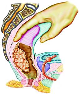Chirurgul patrunde cu mana dreapta in spatele rectului, in scobitura sacrata, pentru a elibera prin disectie digitala boanta ampula rectala (Fig. 5). In mod obisnuit, rectul poate fi eliberat pana aproape de coccis. Aceasta manevra poate aprecia fixitatea laterala a tumorii si arata daca, intr-adevar, tumora poate fi mobilizata si extirpata.