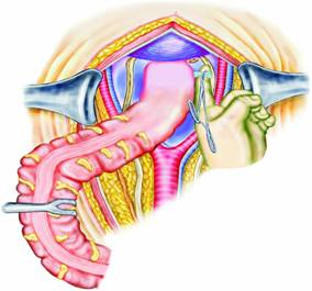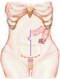 Se practica o incizie mediana suprapubiana prelungita putin supraombilical. Dupa protejarea peretelui prin campuri se monteaza un departator autostatic.