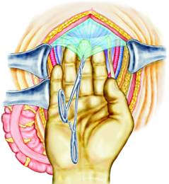 Fig. 20 - Ligatura vaselor hemoroidale mijlocii in aripioara laterala a rectului