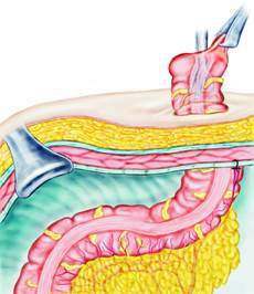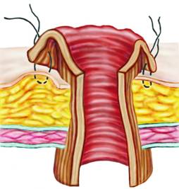 Fig. 18 - Realizarea colostomiei terminale; puncte de sutura colo-cutanate